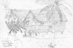 Construction d’une oka traditionnelle Oyampi à Trois-Sauts, à l’extrême sud de la Guyane, sur l’Oyapock. Dessin fait à la gouache.