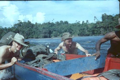 La remontée du Maroni et de l’Inini se passa sans problèmes et nous nous enfoncions chaque jour un peu plus dans des terres sauvages et vierges à cette époque de toutes traces humaines. On voyait des animaux en quantité, caïmans, jaguars, perroquets, singes, anacondas. Cette rivière maintenant détruite par la chasse, le tourisme et l’orpaillage était à l’époque un riche paradis naturel.