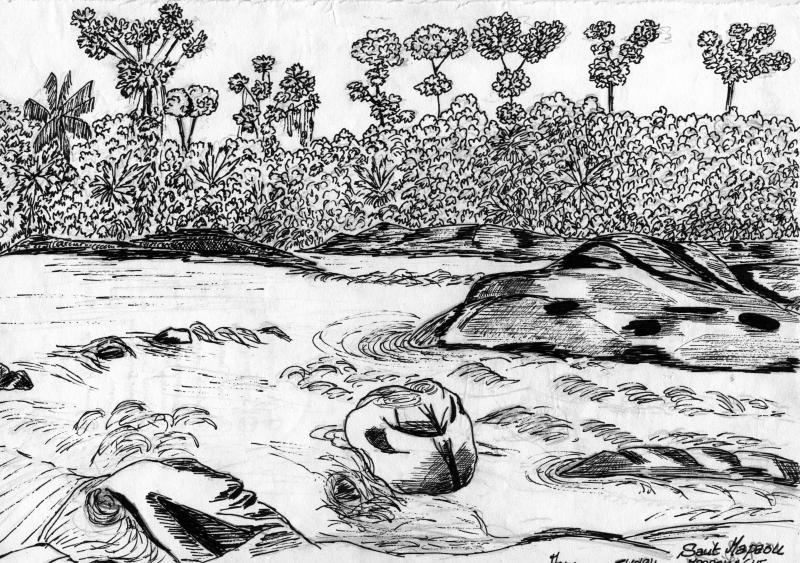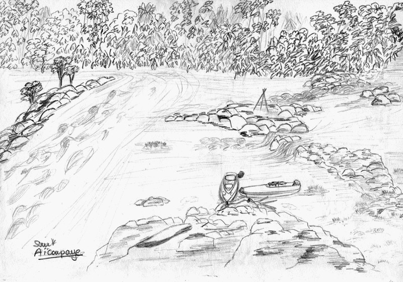 Lors de l’expédition, Monique a sorti son carnet de croquis et comme les explorateurs du XIX, elle a illustré ce quelle voyait avec ses crayons. Quelques dessins réalisés sur le fleuve Approuague.