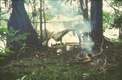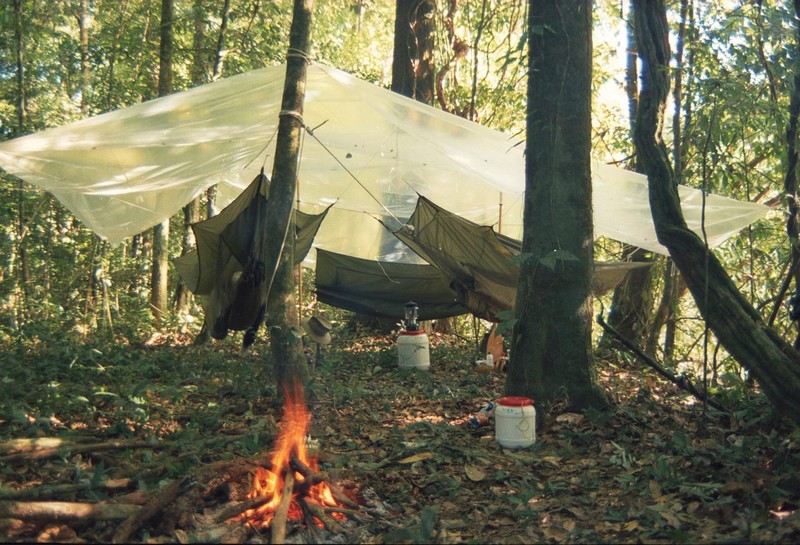 - Le hamac de style US. Fabriqué à l’origine dans de la toile de parachute, c’est le plus facile à trouver et le moins cher des hamacs de jungle. Il existe des modèles de qualité très inégale. Lors de l’achat, vérifiez bien les coutures, leur solidité, la qualité des matériaux utilisés. Il faut prendre impérativement un modèle avec double fond pour éviter les piqûres des insectes à travers le hamac. Le double fond sert souvent de rangement et de vide-poche par le biais d’une ouverture qui doit fermer hermétiquement. La moustiquaire doit fermer elle aussi hermétiquement grâce à du velcro (qui ne tombe jamais en panne) ou une fermeture éclair, plus fragile, elle doit donc être d’excellente qualité. Le toit n’est pas étanche à la pluie, le hamac doit être placé sous un carbet ou sous une bâche, voir la page sur les bivouacs. C’est ce modèle que j’utilise avec beaucoup de plaisir, même en camping au Québec. Il garantit des nuits paisibles et confortables, il est peu encombrant et léger dans le sac à dos et sans lui la vie est difficile en forêt. C’est le meilleur compagnon du broussard avec sa machette et un bon feu !