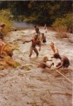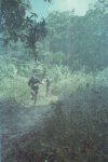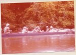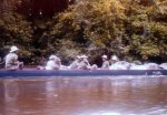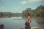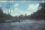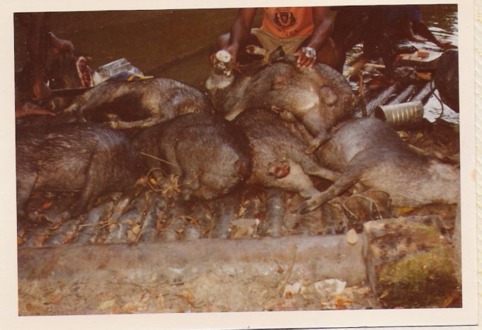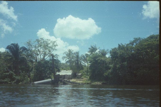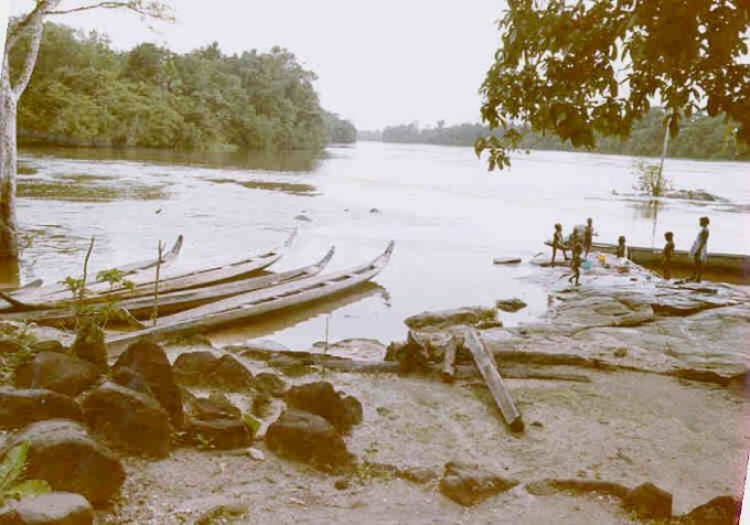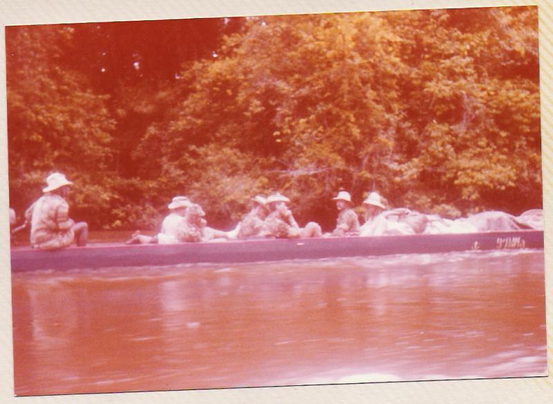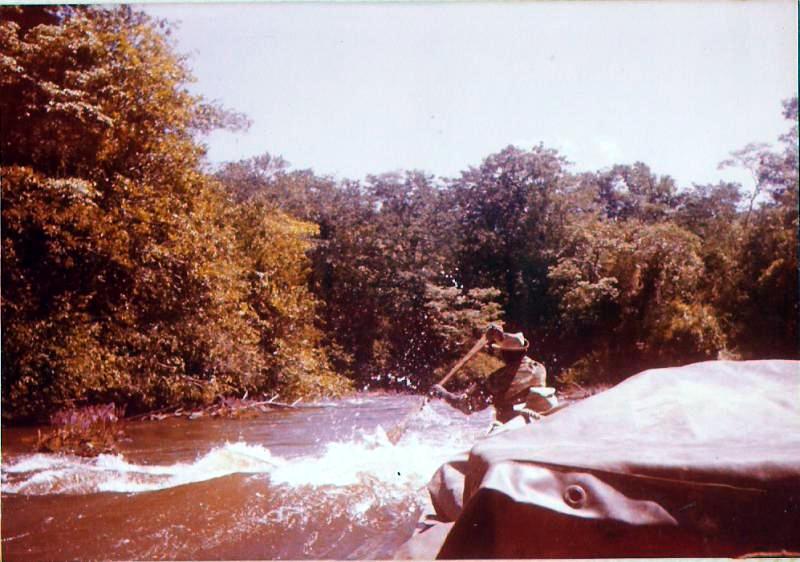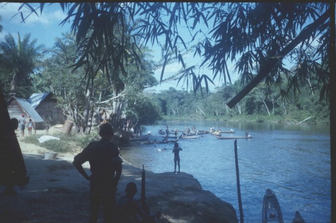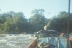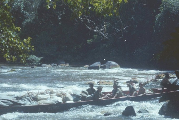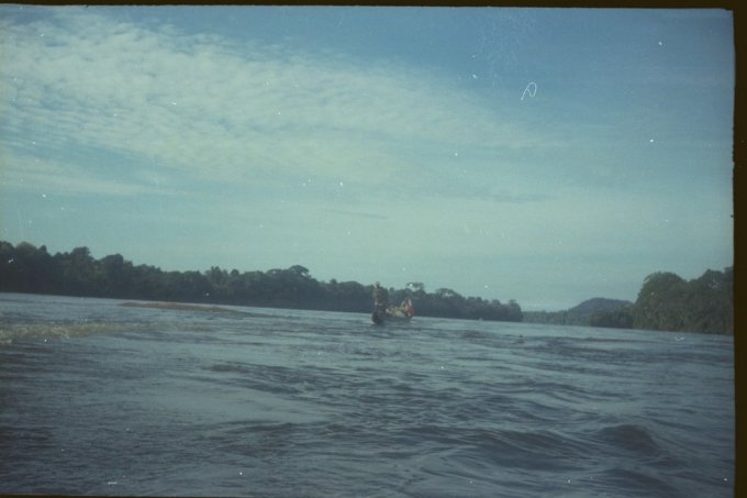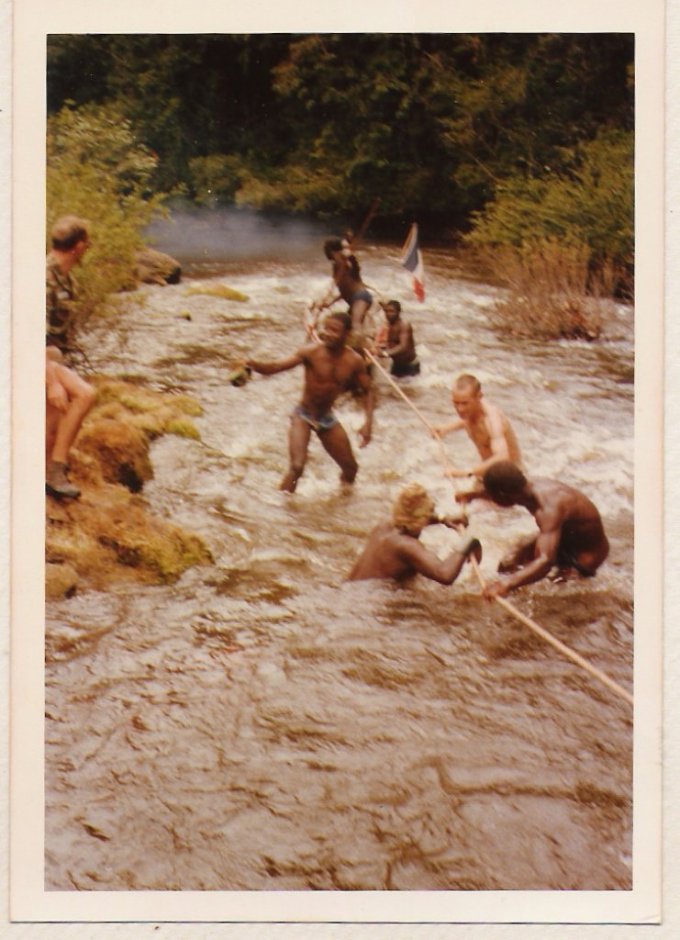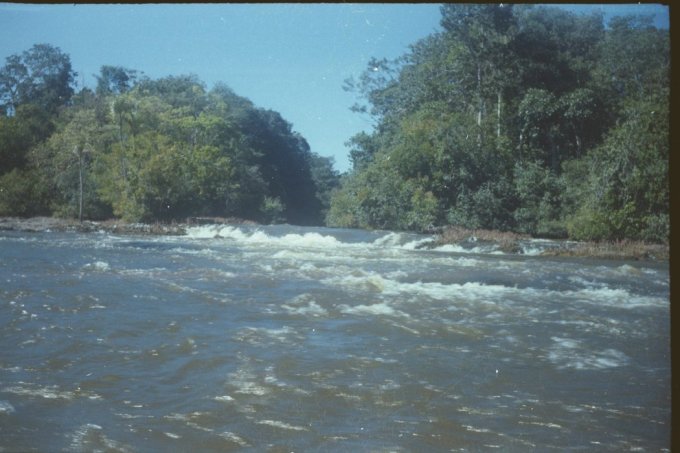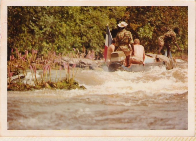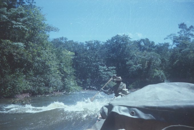 À chaque passage de saut difficile, les piroguiers s’enfilent une rasade de rhum, ce qui n’est pas pour me rassurer, car plus ils boivent, plus ils prennent de risques allant même jusqu’à faire la course dans de périlleux rapides. C’est ainsi que nous avons failli couler en franchissant un saut d’aspect redoutable. Le canot lancé à fond, c’est immobilisé par manque de puissance dans le courant principal au milieu des rochers. Malgré le moteur qui rugit au maximum de sa capacité et qui mouline vainement les flots dans une tentative désespérée de franchir cette muraille d’eau rugissante, malgré les efforts désespérés du bossman, arc bouté sur son takari qui essayait par des efforts surhumains de faire gagner au canot les quelques dizaines de centimètres qui manquent pour franchir le saut, nous restons immobile au milieu des flots en furie. Puis, insensiblement, le canot s’est mis à dériver et pour comble de malheur, la perche du bossman c’est coincée entre deux roches. Le bossman déséquilibré tombe du canot et reste perché en l’air, seul sur son takari, cramponné comme il le peut à la fragile perche de bois pour ne pas être entraîné dans le courant terrifiant qui se brise sur des roches coupantes un peu plus basses. Le canot se met insensiblement en travers du courant malgré les efforts aussi désespérés qu’inutiles du motoriste. Il heurte une roche se cintrer comme une banane au milieu du courant, puis miraculeusement au moment ou la rupture semblait inévitable, alors que nous nous voyons projeté dans les flots au milieu de rapides terrifiants le canot c’est dégagé. Le canot est plein d’eau, jusqu’aux plats-bords et nous écopons utilisant gamelles, casquettes, tout ce qui nous tombe sous la main pour alléger l’embarcation et la rendre manoeuvrable. Le motoriste reprend le contrôle de l’embarcation tordue et réussit à l’échouer sur une plage qui surgit providentiellement au milieu des rochers en plein rapides ! Juste assez de place pour nous échouer et nous mettre en sécurité. Mon brave petit caporal était vert de peur et restait sans réaction. Le bossmann fut promptement récupéré toujours perché sur son takari au milieu du rapide par un autre canot. Nous avons dû écoper le canot, lui faire subir une inspection rapide et nous nous sommes relancés à l’assaut du rapide avec notre canot déformé et cette fois-ci nous fûmes victorieux. Seul détail, j’ai dû passer le reste de la mission à écoper, car notre canot, malgré quelques rafistolages avec du goudron et de la tôle de boîte de conserve, fuyait. Bien sûr, c’était un travail ingrat, indigne d’un caporal, radio de surcroît et je du faire sa part...