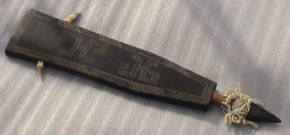 Il présente deux faces planes noircies et décorées de motifs gravés au couteau. C’était une arme redoutable utilisée lors des attaques nocturnes. Il en est souvent fait mention dans les récits légendaires. Il est taillé dans le bois d’arc et incrusté de canines de pécari ou de pierres polies fixées à l’aide de résines et de cordelette végétale.