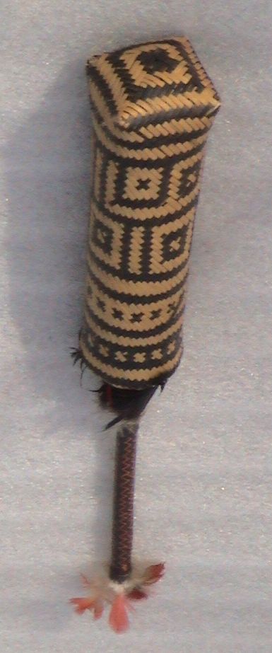 Cet objet de tradition apalai est fabriqué en arouman. Il renferme un cartilage cricoïde de singe hurleur ou encore une petite calebasse contenant des perles et des graines. C’est l’instrument qu’emploient les chamans pour officier.
