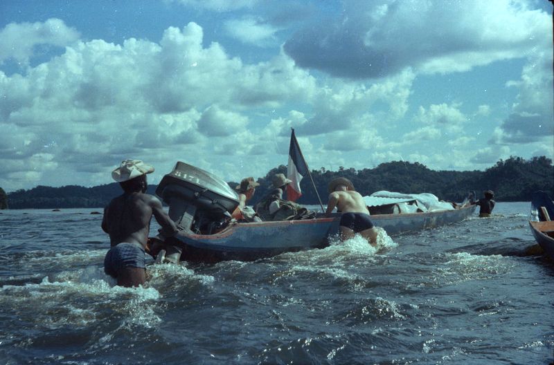 Il faut souvent sortir des pirogues ou des canoës pour effectuer des passages de Sauts à la cordelle ou traîner les bateaux dans des zones peut profondes. Lorsque l’on chemine à pied, les rives sont souvent trop encombrées et il peut être plus facile de progresser dans le cours d’eau.