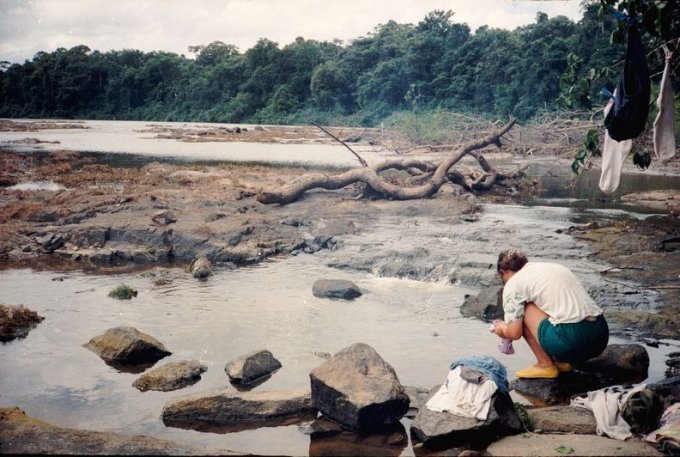 Un oeil sur la vaisselle, un oeil pour surveiller les alentours. Un jour en lavant du linge, je me suis fait arracher des mains une chaussette par un poisson vorace.