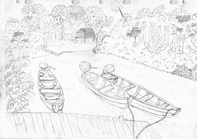 Lors de l’expédition, Monique a sorti son carnet de croquis et comme les explorateurs du XIX, elle a illustré ce quelle voyait avec ses crayons. Quelques dessins réalisées à Trois Sauts.